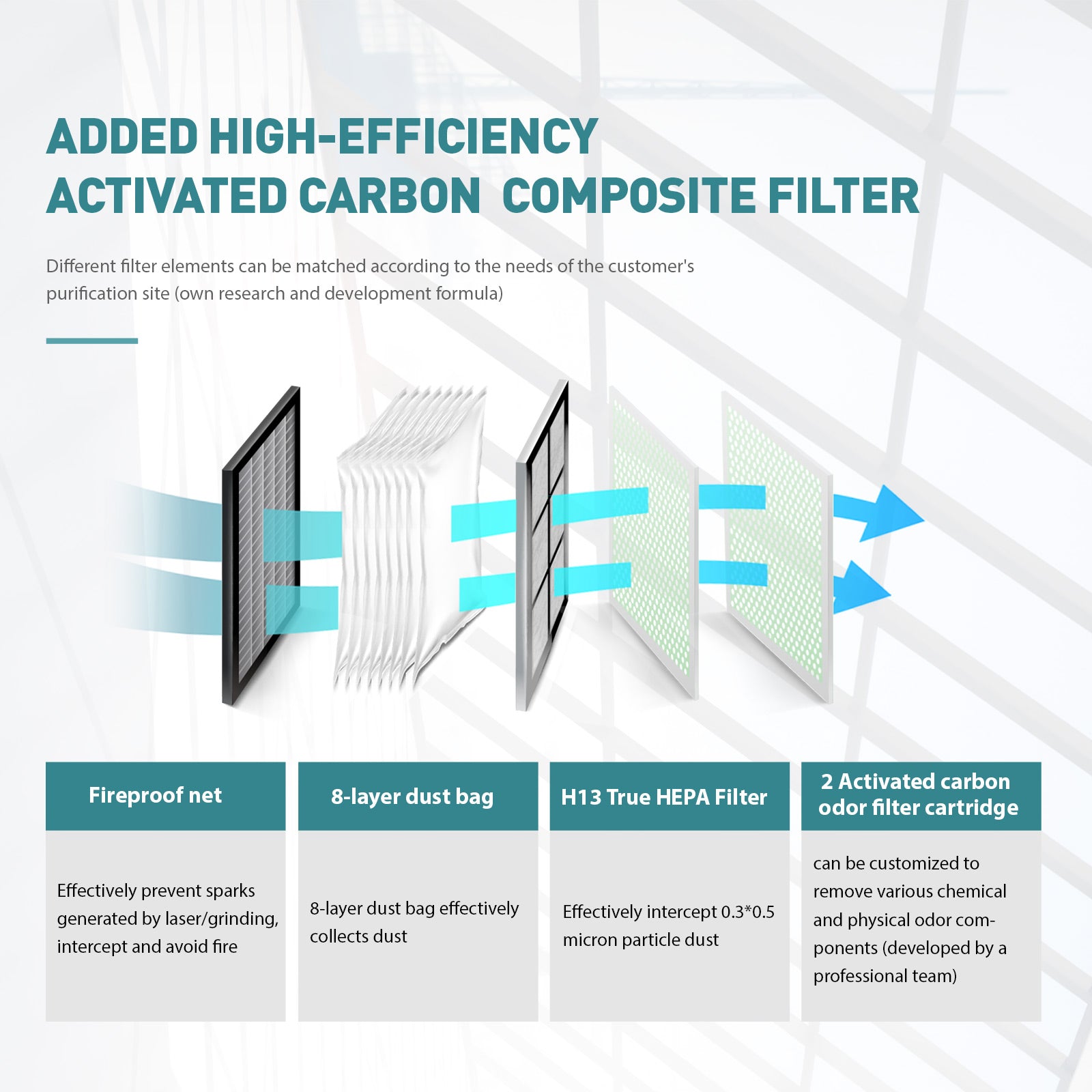 - High Filtration Efficiency: With a filtration effect of 0.5μm at 99.9%, it ensures optimal air purification for laser operations. Customized Activated carbon odor filter cartridge to remove various chemical and physical odor components. Fireproof net Effectively prevents sparks generated by laser/grinding,intercepts and avoids fire.
